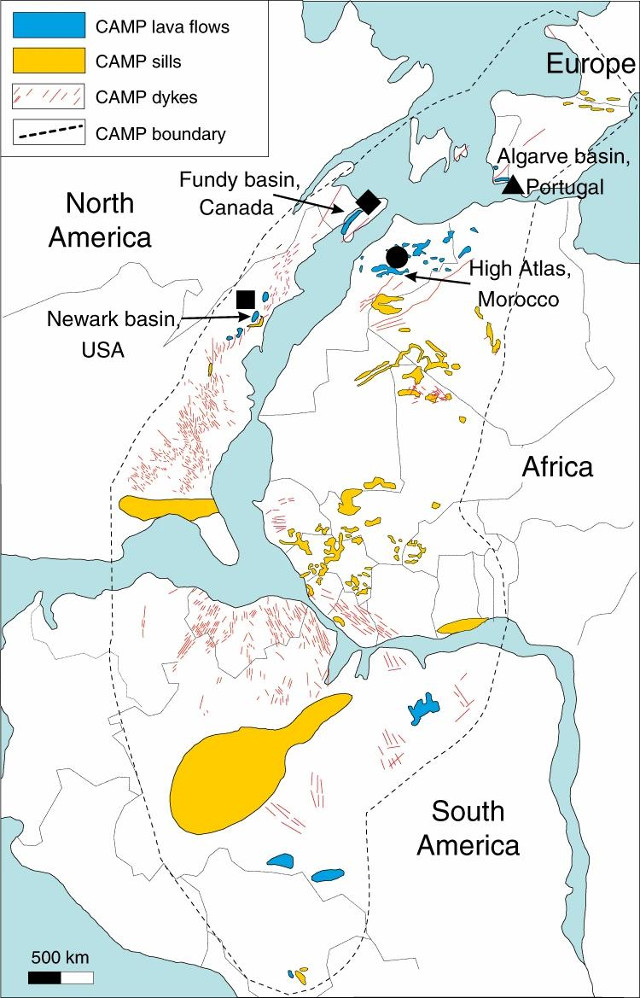 The bottom image (Courtesy Capriolo, M., Marzoli, A., Aradi, L.E. et al.) shows the map of the Central Atlantic Magmatic Province at the time of Pangea, about 200 million years ago. In blue the positions of the lava flows are shown, in yellow those of the sills, with the red dashes those of the dykes.