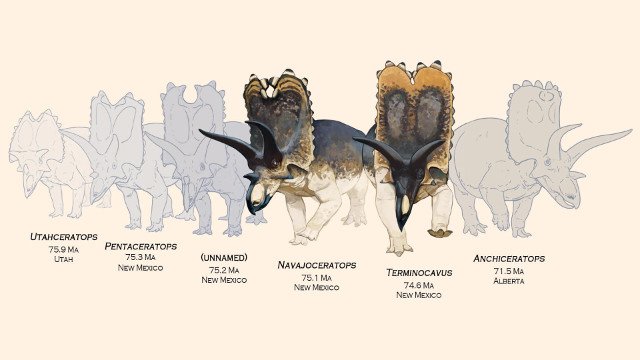 A hypothesis proposed already in the 1990s concerned the possibility that Pentaceratops sternbergii was an ancestor of Ankiceratops ornatus. The discovery of the new species Navajoceratops sullivani and Terminocavus sealeyi brings evidence to support it thanks to some intermediate characteristics that show an evolution of the skull’s shape. The evolution of a group of Chasmosaurinae could start even earlier, from another species already known called Utahceratops gettyi.