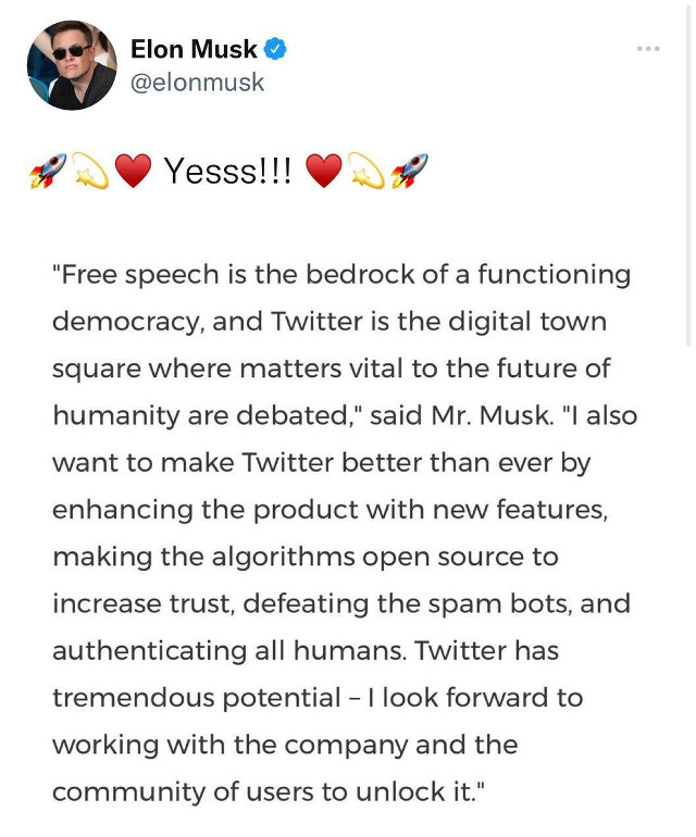 Twitter’s board of directors accepted Elon Musk’s offer to buy the social network for $54.2 a share in a $44 billion deal. One consequence will be that Twitter will be a private company again leaving the Wall Street Stock Exchange. In early April, Musk bought 9.2% of the social network but decided not to join its board. Now, his stated goal is to change Twitter to ensure free speech, which he sees as a bedrock of democracy.