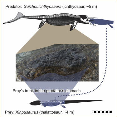 The Guizhouichthyosaurus tangae specimen discovered in 2010 was almost complete, but above all in its stomach, it contained the middle section and part of the legs of a thalattosaur whose tail was discovered meters away. There’s no certainty that the ichthyosaur killed the thalattosaur after hunting it, and it’s possible that it found a dead animal and ate it. However, in that case, the researchers would expect to find a limbless body because limbs would be the first to detach during decomposition.